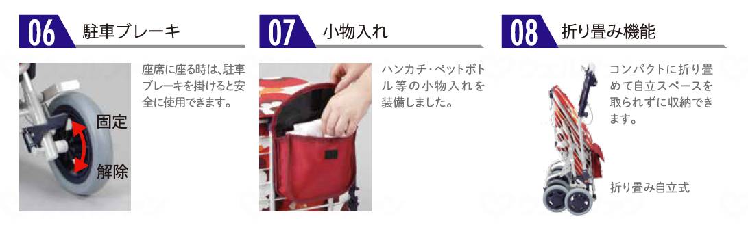 | 材質 | 押し手ハンドル部:TPR樹脂・ABS樹脂 開閉グリップ:PP フレーム:アルミニウム タイヤ:EVA発泡車輪 バッグ部:綿(花柄)・ポリエステル(ワイン・ネイビー) |
